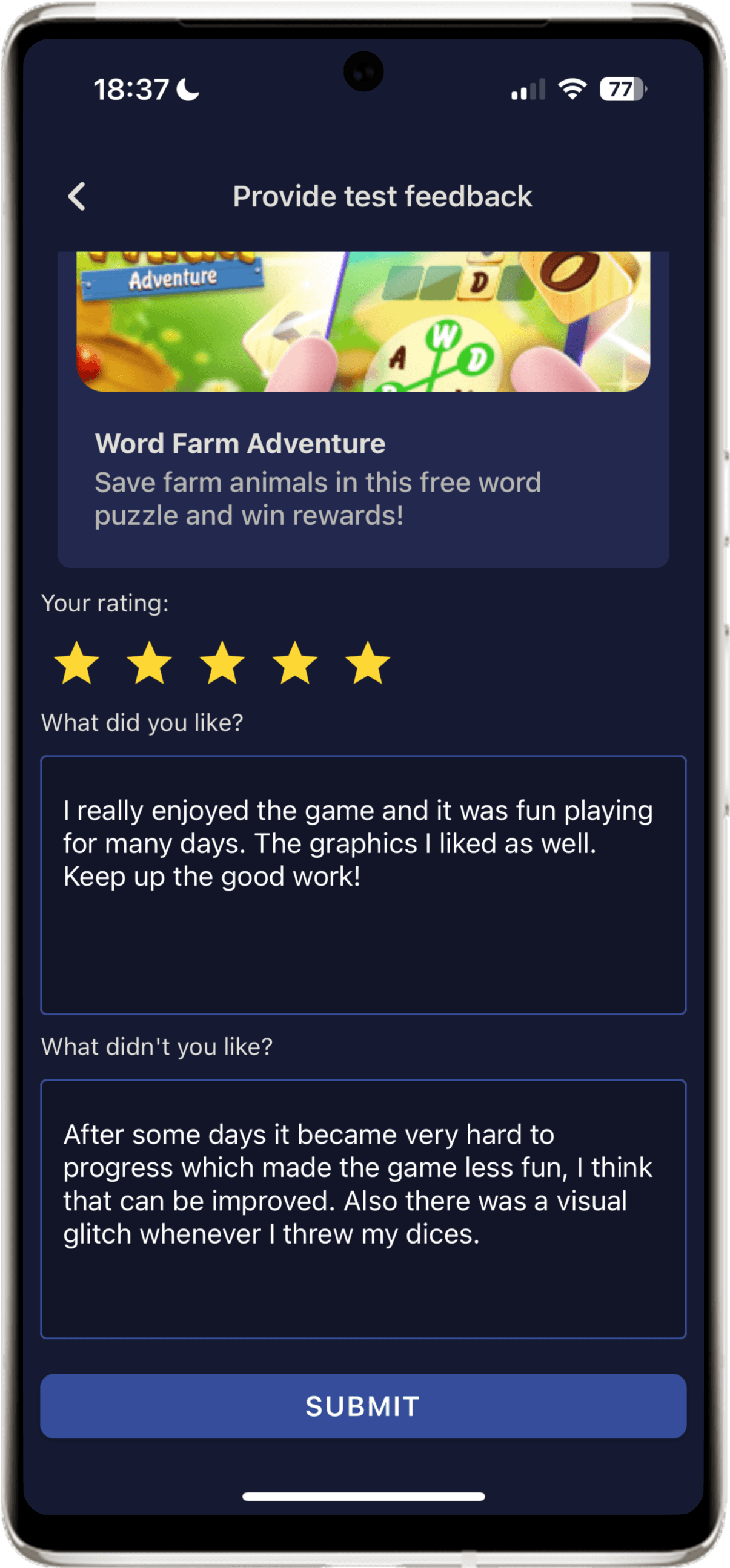 Download a game you might like. Start testing and provide Feedback directly to our partners about their games. Help us make a difference in the mobile gaming world!